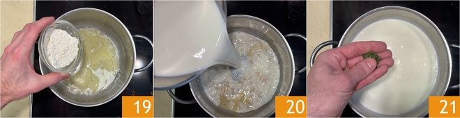 Añadid la harina 19 y mezclad. Verted la leche caliente poco a poco mientras removéis con una batidora de mano 20, continuad la cocción a fuego bajo hasta el hervor, removiendo continuamente 21. Cuando la bechamel esté espesa y cremosa 21, sazonad con el tomillo, retiradla del fuego y cubridla con film en contacto.
