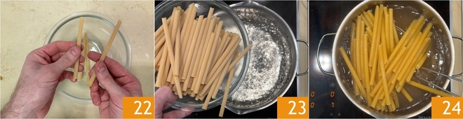 Pasad luego a la pasta: romped las zite por la mitad 22 y hervidlas en agua con sal durante aproximadamente 5 minutos 23, luego escurridlas 24.