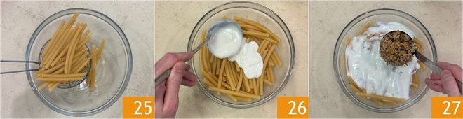 Transferid la pasta a un bol grande 25. Añadid un tercio de la bechamel 26 y un tercio del ragú 27.
