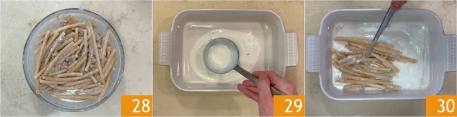 Mezclad bien para distribuir el condimento 28. Tomad ahora una bandeja de horno de 20x28 cm: extendid una capa de bechamel en el fondo 29 y disponed las zite de manera horizontal, alineándolas ordenadamente 30.
