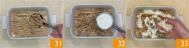 Cubrid con más ragú 31, unas cucharadas de bechamel 32 y un puñado de Parmigiano Reggiano rallado 33.