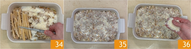 Disponed luego la segunda y última capa de pasta, esta vez en vertical 34, y completad con el ragú restante y casi toda la bechamel restante 35. Esparcid generosamente la superficie con Parmigiano Reggiano rallado 36.