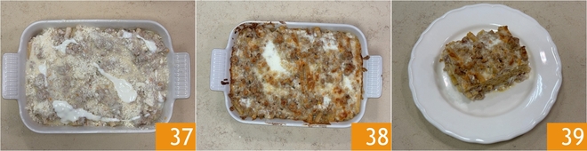 Distribuid en la superficie la bechamel reservada 37 y coced en horno estático precalentado a 170°C durante 15 minutos, luego continuad la cocción durante 10 minutos a 230°C en modalidad estática. Cuando la superficie esté dorada y ligeramente crujiente 38, sacad del horno y dejad templar vuestros ziti al horno en blanco durante unos minutos antes de servirlos 39!
