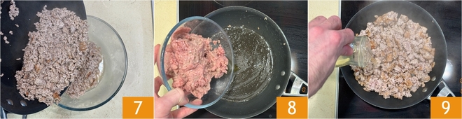 Transferidla a un bol 7 y haced lo mismo con la carne de cerdo 8, apagándola con el vino restante 9.