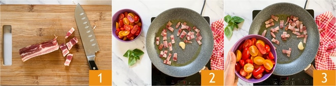 Para preparar los ziti con tomatitos, panceta y stracciatella, retira la corteza de la panceta y luego córtala en tiras 1. Lava los tomatitos y córtalos por la mitad. Calienta un diente de ajo aplastado en camisa en una sartén con el aceite, añade la panceta y déjala dorar unos instantes 2. Agrega los tomatitos 3.