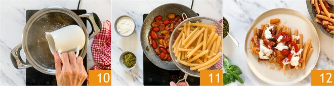 Reserva un poco de agua de cocción 10. Escurre los ziti y viértelos en la sartén con la salsa 11, saltea y ajusta la cremosidad con algunas cucharadas de agua de cocción de la pasta. Emplata con la stracciatella y el crumble de pistachos 12.