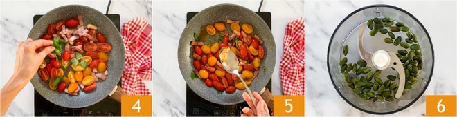 Aroma con algunas hojas de albahaca 4, sal y pimienta y cocina durante 7 minutos, después elimina el ajo 5. Pon al fuego una cazuela llena de agua con sal y llévala a ebullición, servirá para cocinar los ziti. Prepara el crumble de pistachos: tritura los pistachos en un procesador 6.