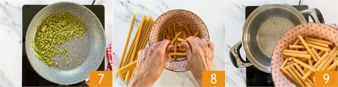 Vierte en una sartén una cucharada de aceite de oliva virgen extra, una cucharada de pan rallado y el granillo de pistachos 7, sala y tuesta durante 2-3 minutos a fuego moderado. Rompe los ziti en tres partes 8 y cocínalos al dente en abundante agua con sal 9.