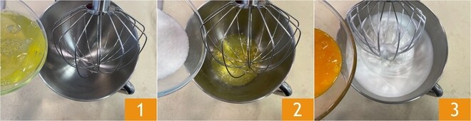 Para preparar el zuccotto selva negra, comenzad con la masa de bizcocho de cacao: en una batidora con varillas, montad las claras 1 con el azúcar 2 hasta obtener una consistencia cremosa y brillante. Batid las yemas con un tenedor e incorporadlas a la mezcla con una espátula 3.