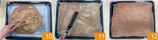 Verted la masa en un molde grande de aproximadamente 45x37 cm, engrasado con aceite y con la base cubierta de papel de horno 10, nivelad bien con la espátula 11 y hornead en horno estático precalentado a 190°C durante unos 15-20 minutos en la rejilla central. Sacad la masa de bizcocho del horno 12.