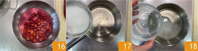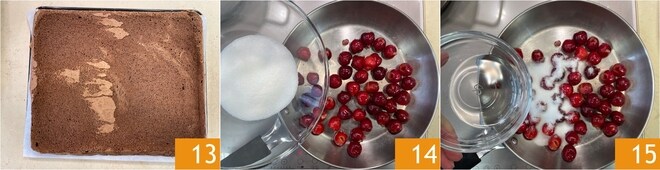 Voltead inmediatamente el dulce aún caliente 13, luego cubrid toda la superficie con film en contacto y dejad enfriar. Deshuesad las cerezas y cocinadlas en una sartén con el azúcar 14 y el licor 15.