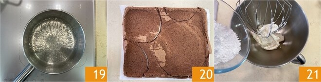 Dejad enfriar completamente 16 y preparad el remojo: llevad el agua con el azúcar a ebullición 17, dejad templar y añadid también el licor 18.