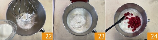 Verted la nata fresca 22 y montad la crema hasta que esté espumosa y homogénea 23. Tomad 500 g de la mezcla y añadid las cerezas cocidas 24; conservad en el frigorífico el resto de la mezcla que servirá para decorar.