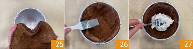 Forrad con film un molde de zuccotto de aproximadamente 10 cm de alto y con una base de aproximadamente 20 cm de diámetro. Colocad dentro el disco más grande de masa de bizcocho 25 y humedecedlo con el remojo 26. Verted la mitad del relleno dentro del molde 27.