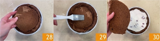Luego colocad el disco más pequeño de masa de bizcocho 28 y humedecedlo por ambos lados 29. Añadid el relleno restante, luego cerrad con el disco intermedio obtenido de los recortes 30.