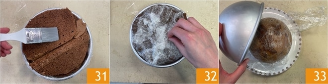 Humedeced ligeramente y cerrad la superficie con film en contacto 32. Guardad en el frigorífico durante al menos 3 horas. Pasado el tiempo de reposo, desmoldad el zuccotto en un plato de servir 33.