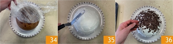 Eliminad el film 34 y cubrid toda la superficie con una capa fina de la mezcla restante a base de nata y mascarpone 35. Con un pelador de patatas, realizad rizos de chocolate y hacedlos adherir a la superficie del zuccotto 36.