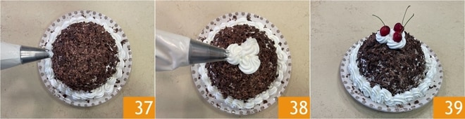 Finalmente, con una manga pastelera, cread un borde en la base 37 y montones decorativos en la superficie 38, completando con tres cerezas colocadas en el centro 39. Dejad enfriar en el frigorífico durante al menos una hora antes de servir vuestro zuccotto selva negra.