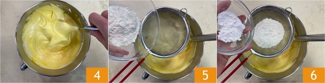 Mezclad suavemente 4, luego tamizad la harina 00 5 y la levadura 6 dentro de la masa.