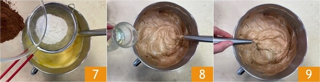 Incorporad también el cacao tamizado 7 y, finalmente, verted el aceite 8, mezclando siempre con una espátula 9.
