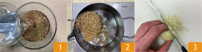 Para preparar la sopa de farro y lentejas, lo primero es poner las lentejas a remojo en agua fría 1 durante 2 horas. Escurridlas, ponedlas en una olla con agua fría con sal 2 y cocinad durante 30 minutos. Escurridlas de nuevo y reservad tanto las lentejas como el agua de cocción. Picad finamente la cebolla 3.