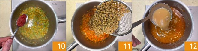 Agregad el concentrado de tomate 10 y las lentejas 11. Cubrid con agua de cocción de las lentejas 12.
