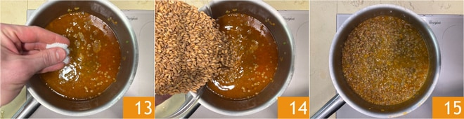 Ajustad de sal 13. Añadid también el farro 14 y cocinad durante 30 minutos 15. Si es necesario, verted más agua de cocción de las lentejas.
