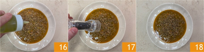 Emplatad y completad con un chorrito de aceite 16 y una pizca de pimienta 17. La sopa de farro y lentejas está lista para ser disfrutada 18