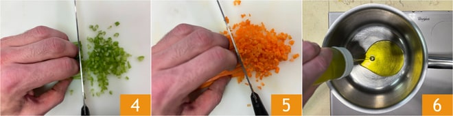Haced lo mismo con el apio 4 y la zanahoria 5. En la misma olla en la que cocinasteis las lentejas, verted el aceite 6.