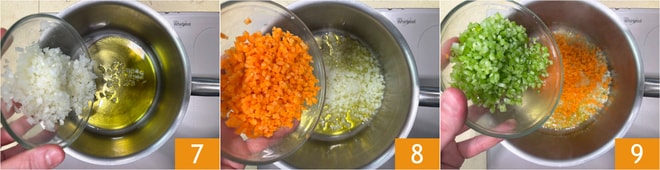 Añadid cebolla 7, zanahoria 8 y apio 9. Sofreíd durante unos minutos.