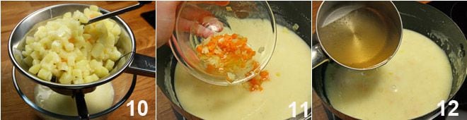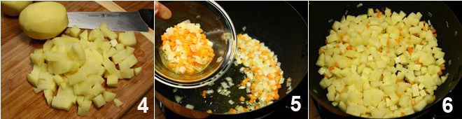 Mientras tanto pela las patatas y córtalas también en cubitos 5, cuando el puerro y la zanahoria estén pochados, retira 2/3 y ponlos a un lado, luego añade las patatas (5-6) a la olla, que dejarás dorar y saborear junto con el puerro y la zanahoria restantes.