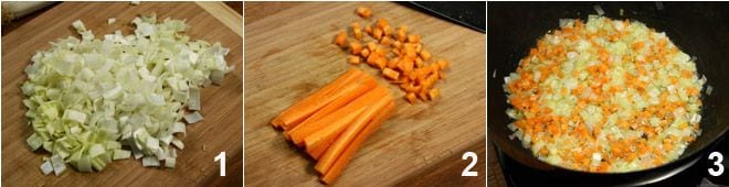 Primero prepara las verduras, toma el puerro y quítale la parte verde más dura, luego corta la parte blanca, a la mitad divídelo y corta unas tiras que luego reducirás en cuadritos 1; haz lo mismo con la zanahoria 2. En una sartén grande pon a calentar la mantequilla junto con el aceite, añade el puerro y la zanahoria 3 y deja pochar a fuego bajo durante unos 15 minutos.