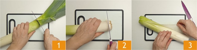 Para preparar la sopa de puerros, como primer paso elimine la parte verde del puerro 1, corte las raíces 2 y quite las hojas más externas 3.