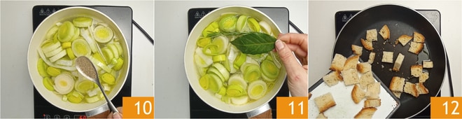 Cocine a fuego medio durante 2 minutos 13, girando a menudo para evitar que se quemen. A pocos minutos del final de la cocción, triture, con una batidora de inmersión 14, aproximadamente la mitad de los ingredientes para obtener una sopa aún más sustanciosa. Sirva la sopa y complete con el pan tostado. Su sopa de puerros está lista para ser servida 15.