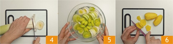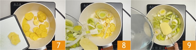 En una sartén caliente el aceite, añada las patatas 7 y dórelas durante 2 minutos. Escurra los puerros, únalos en la sartén 8, mezcle y continúe la cocción por otros 2 minutos. Vierta agua hasta cubrir los ingredientes 9.