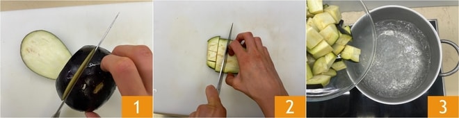 Para preparar las albóndigas de berenjenas al horno, lavad las berenjenas, secadlas y cortadlas primero en rodajas 1 y luego en cubos 2. Escaldadlas en agua hirviendo con sal 3 durante unos 5 minutos.