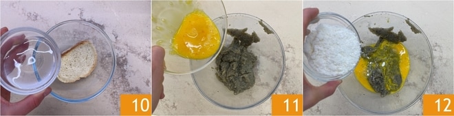 Remojad el pan con muy poca agua 10. Colocad las berenjenas en un bol con los huevos batidos 11 y el queso pecorino rallado 12.