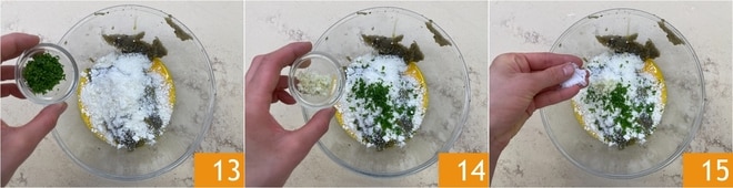 Agregad también el perejil picado 13, el concentrado de tomate, el ajo 14, la sal 15 y la pimienta.
