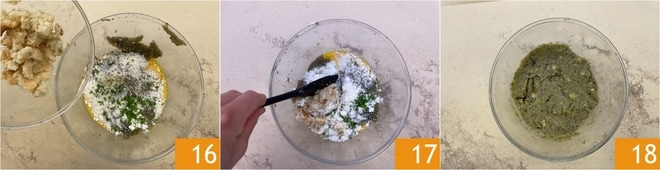 Añadid el pan duro bien escurrido 16 y mezclad 17. Amasad con las manos si es necesario hasta obtener una masa homogénea 18. Cubrid la masa con film y dejad reposar media hora en la nevera.