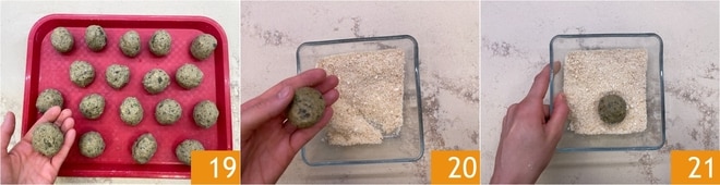 En un bol mezclad el pan rallado con el queso parmesano. Transcurrido el tiempo de reposo, formad albóndigas de 35 g cada una 19 y pasadlas una a una en la mezcla de pan y queso 20 21.