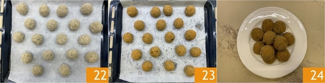 A medida que las hagáis, colocadlas en una bandeja forrada con papel de horno 22; con estas cantidades deberíais obtener alrededor de 36. Coced a 200° en horno estático precalentado durante 30 minutos. Cuando estén bien doradas, sacad las albóndigas de berenjenas del horno 23 y servidlas calientes 24!