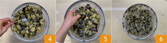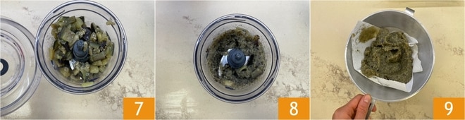 Colocadlas en una batidora 7 y triturad rápidamente, hasta obtener una crema 8. Trasladadla a un colador con una gasa y dejad escurrir aún más 9.