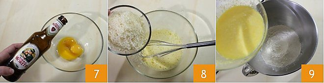 En un bol batid los huevos junto con la cerveza 7, luego añadid el Parmesano 8, la sal y mezclad todo. Coged una batidora con el accesorio de pala, poned dentro la harina tamizada y transferid la mezcla de huevos a la batidora 9 (si no disponéis de una batidora, poned los ingredientes en un bol y amasad a mano).