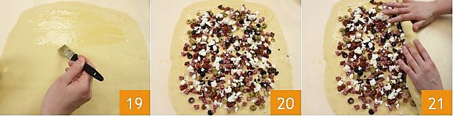Pincelad la hoja obtenida con aceite de oliva virgen extra 19 y espolvoreadla con los ingredientes que habéis cortado previamente: salami, aceitunas negras, aceitunas verdes, tomates secos y feta 20. Empezad a enrollar la hoja desde el lado más largo, procurando apretarla lo más posible para que no se salga el relleno 21.