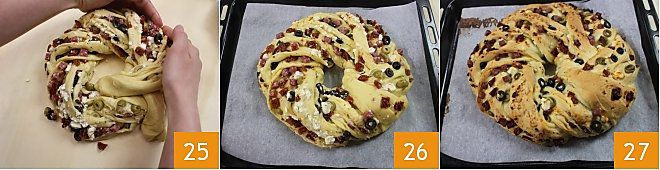 Formad con la trenza un rosco y unid los dos extremos superponiéndolos 25, colocad la angelica en una bandeja forrada con papel de horno 26 y dejadla fermentar durante 30 minutos en el horno apagado con la luz encendida hasta que haya duplicado su volumen. Pasados los 30 minutos, hornead la angelica en horno estático precalentado a 180° durante 35 minutos (o en horno ventilado a 160° durante 25 minutos). Cuando la superficie esté dorada, sacad la angelica salada a la cerveza del horno 27 y dejadla templar antes de llevarla a la mesa.