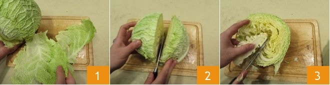 Para preparar el arroz y repollo, comenzad a realizar el Caldo de verduras. Una vez listo, lavad cuidadosamente y secad el repollo. Deshojadlo eliminando las hojas más externas 1, cortadlo por la mitad 2 y eliminad la costilla central más coriácea, ayudándoos con un cuchillo de hoja pequeña pero afilada: bastará con realizar un corte en triángulo alrededor de la parte a eliminar 3.