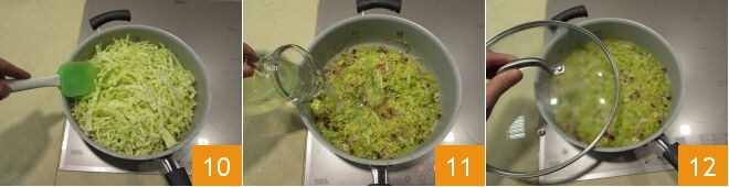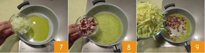 En una cacerola de fondo antiadherente y bordes altos, sofreíd a fuego bajo la cebolla con el aceite 7, removiendo de vez en cuando. Cuando esté dorada, añadid la panceta 8: dejadla dorar unos minutos para que forme una ligera costra en superficie. Seguid removiendo para evitar que la panceta y la cebolla se peguen al fondo de la cacerola. En este punto, añadid el repollo 9.