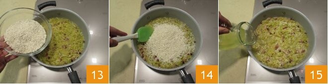 En este punto, añadid el arroz 13, amalgamad bien los ingredientes 14 y verted el caldo restante 15. Dejad cocer a fuego moderado hasta obtener una especie de sopa densa y casi seca.