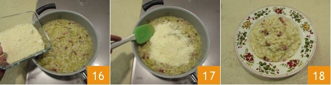 Unos minutos antes de finalizar la cocción, añadid el queso rallado 16, mezclad removiendo 17. Por último, ajustad de sal y pimienta y servid vuestro arroz con repollo 18!
