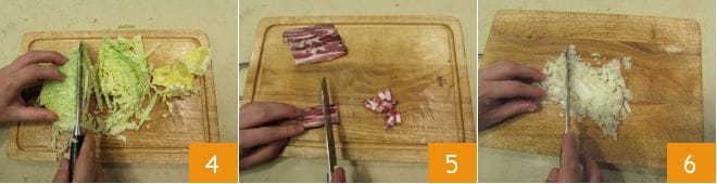 Cortad la verdura en juliana 4 y reservadla. Proceded cortando primero en tiras y luego en cubos la panceta 5, reservándola también. Después de mondar la cebolla, obtened un picado finísimo 6.